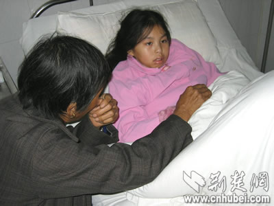 在縣人民醫(yī)院內(nèi)三科9病房里,潔白的病床上躺著一個面色蒼白、嘴唇發(fā)烏的小姑娘,她就是楊青。在楊青艱難地望過來的時候,記者的心不禁打了個顫:大眼睛沒有一絲神采!記者反復(fù)醞釀的問候語哽在喉中。楊青的父母、奶奶、姑媽,卻忍不住悲傷,淚如雨下!皸钋,你痛不痛?”“痛……”楊青張了張嘴,聲音弱得幾乎聽不見。“哪里痛,告訴阿姨好嗎?”“全身都痛!睏钋囝澏吨鲁鲞@4個字后,不再開口說話。