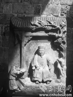 當(dāng)日,記者在該鎮(zhèn)八角亭村劉貴灣見到了這尊雕像。神龕下面,一村民小心翼翼地抱下一塊40余厘米高,30余厘米寬,10余厘米厚的“石頭”,上面布滿灰塵,一位村民虔誠(chéng)地為這位“太公”“洗了個(gè)澡”,一幅人物情景雕像出現(xiàn)在人們面前(如右圖):一位富態(tài)老年男子端坐太師椅,男子右側(cè)前方有一人托盤而立,盤子中間放著茶壺(此人頭部和茶壺都破碎不存),男子左前方則雕有一盆臘梅,直到屋頂,梅花和喜鵲栩栩如生,青磚碧瓦,歷歷在目,而富態(tài)男子就連胡須的“紋路”都雕了出來(lái),雙目傳神。