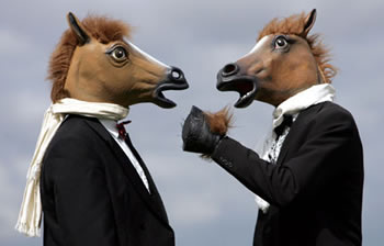英國埃普瑟姆德比賽馬會是歐洲最豪華排場的賽馬大會,為期兩天。圖為觀眾戴著馬頭交談。