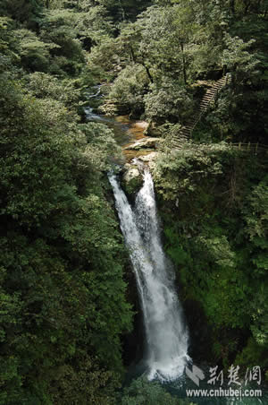 參觀完兩處紅色旅游景點之后,記者們順道觀光了龍?zhí)讹L景區(qū)。龍?zhí)段挥诖钠何鞅逼吖铮墙陙黹_發(fā)的以自然與人文景觀相結合的旅游風景區(qū)。據介紹,當地的五神河是龍?zhí)丁拔逄妒似佟钡脑慈O疀_擊小井峽谷后,陡然跌落絕壁之下,又連續(xù)飛下四級斷崖,形成梯狀的五個氣勢磅礴的瀑布和深潭,這就是碧玉、金鎖、珍珠、飛鳳、玉女等五潭五瀑。細察五潭,碧水泱泱,樹影幢幢,崖壁如刀削斧鑿,崖腳怪石,汀芷競秀,綠蔭覆蓋四周。仰觀五瀑,潭潭無俗水,瀑瀑似神女。