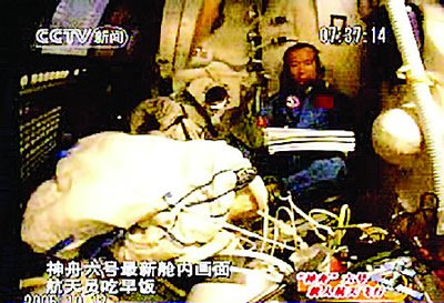 中午12時(shí)35分,神舟六號(hào)飛船正飛越我國(guó)上空,在雷鳴般的鞭炮聲中,慶祝航天英雄聶海勝41歲生日的儀式正式開始,中央電視臺(tái)同步直播。