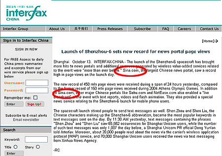 10月14日,俄羅斯國際文傳社報道神六使中國新聞門戶網頁面流量創(chuàng)新高。
