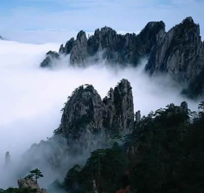 黃山是以自然景觀為特色的山岳旅游風(fēng)景區(qū),奇松、怪石、云海、溫泉素稱黃山“四絕”,令海內(nèi)外游人嘆為觀止。黃山有名的七十二峰,或崔嵬雄渾,或峻峭秀麗,布局錯(cuò)落有致,天然巧成。天都峰、蓮花峰、光明頂是黃山的三個(gè)主峰,海拔高度皆在一千八百米以上,并以三大主峰為中心向四周鋪展,跌落為深壑幽谷,隆起或峰巒峭壁,呈現(xiàn)出典型的峰林地貌。