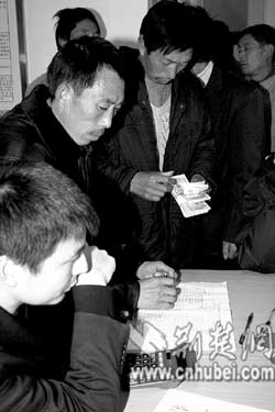 荊門麻城鎮(zhèn)譚珍國(guó)等農(nóng)民工,在天門市勞動(dòng)保障監(jiān)察大隊(duì)領(lǐng)取用人單位所欠的工資款(上圖)。去年12月以來(lái),天門市組織有關(guān)職能部門對(duì)全市37家用人單位支付農(nóng)民工工資情況進(jìn)行專項(xiàng)檢查,共查出6家用人單位拖欠農(nóng)民工工資,他們及時(shí)為2056名農(nóng)民工追回工資180余萬(wàn)元(下圖)。(特約記者肖金舫通訊員劉銀斌攝)