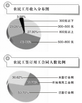 調(diào)查顯示農(nóng)民工月薪多在500到800元之間,22.5%的農(nóng)民工每日工作超10小時(shí)
