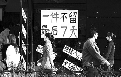 昨日,武漢市江漢路某品牌商店用碩大的“褲”字吸引行人購買欲(圖一)。在市場(chǎng)競(jìng)爭(zhēng)激烈的今天,“臉面”設(shè)計(jì)成為商家費(fèi)勁腦筋追逐的重心,但也有一些商家長期打著“大甩賣”的旗號(hào)欺騙消費(fèi)者,頗煞風(fēng)景(圖二)。記者 張鴻 攝