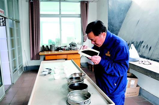 湖北省趙李橋茶廠有限責(zé)任公司檢驗(yàn)室內(nèi),59歲的甘多平將青褐色磚茶原料倒入評(píng)茶盤內(nèi),緩緩搖動(dòng)后,仔細(xì)端詳、細(xì)嗅香氣,“顆粒勻、香氣正,這批原料不錯(cuò)?!?/P>