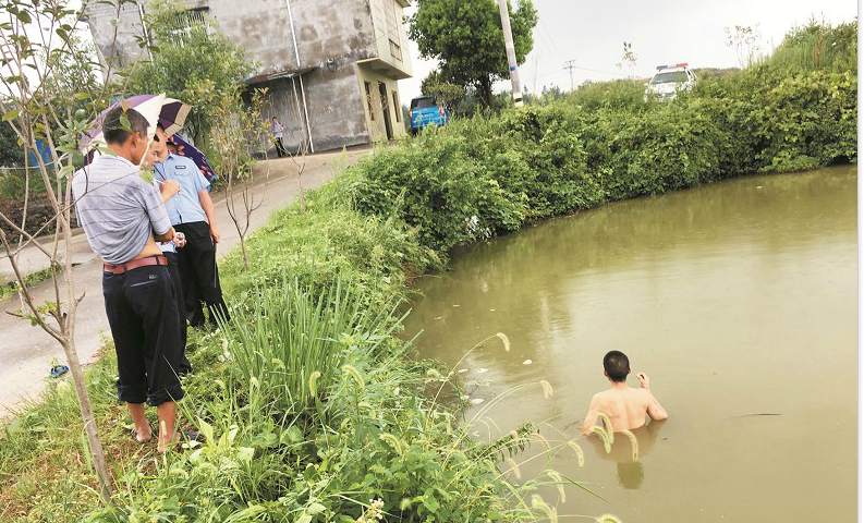 楚天都市報(bào)訊 圖為:萬(wàn)某在水塘里游來(lái)游去不肯上岸