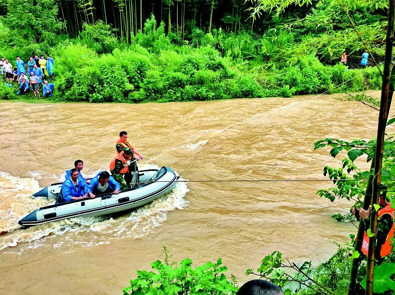 圖為昨日清晨崇陽(yáng)40人送葬隊(duì)伍突遇山洪被困,消防官兵拋繩擺渡安全轉(zhuǎn)移。