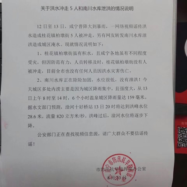 湖北日?qǐng)?bào)網(wǎng)訊(通訊員敖瓊)12日至13日,咸寧普降大到暴雨,一網(wǎng)絡(luò)視頻謠傳洪水造成桂花鎮(zhèn)柏墩街5人被沖走,另有網(wǎng)友轉(zhuǎn)發(fā)南川水庫(kù)泄洪造成城區(qū)淹水。咸寧市防汛抗旱指揮部辦公室發(fā)布說(shuō)明:這些均為不實(shí)信息!情況說(shuō)明如下: