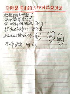 得知女兒給自己寫信,錦瑩的爸爸陳先生既感動又內疚。昨日,他在電話中告訴楚天都市報記者,夫妻倆在浙江打工,大女兒在老家由爺爺奶奶照看,他們平時只是通過視頻交流。他決定再干一段時間后就回老家發(fā)展,好多抽出時間來陪陪孩子。