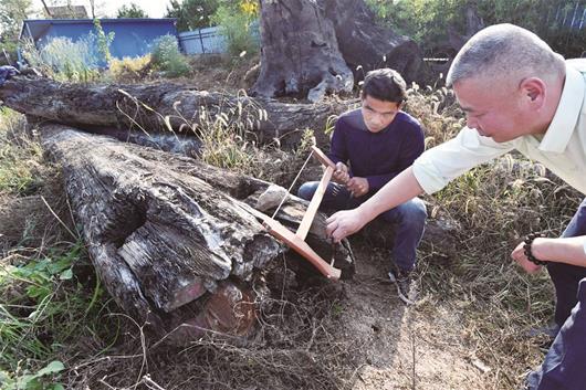 昨日,記者隨幾位園藝、文物專家趕到嘉魚(yú)縣城雷軍的家具廠,只見(jiàn)一根木頭分成兩截堆放在草地上,呈黑色,有厚厚樹(shù)皮,兩頭還各有一個(gè)為方便繩索捆綁打的樹(shù)洞。經(jīng)測(cè)量,長(zhǎng)19米,最寬直徑70厘米。
