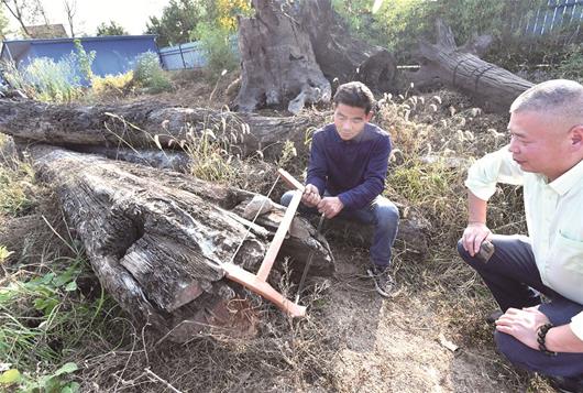 專家檢驗(yàn)?zāi)绢^橫截面 記者萬(wàn)多攝