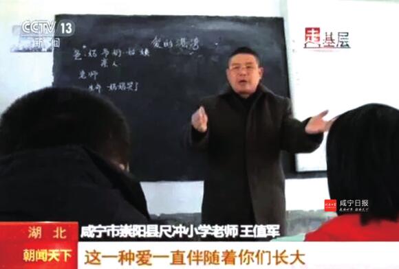 在剛剛過去的元旦佳節(jié),央視《朝聞天下》欄目播出了一則《大山里的擺渡老師》的新聞,在本地教育系統(tǒng)刷屏。新聞的主人公就是崇陽縣尺沖小學(xué)教師王值軍,在這則近8分鐘的新聞里,記錄了王老師接送學(xué)生上下學(xué)、上課、走訪留守兒童家庭等日常工作生活常態(tài),展現(xiàn)農(nóng)村教師堅(jiān)守大山,關(guān)愛學(xué)生的高尚道德情操。