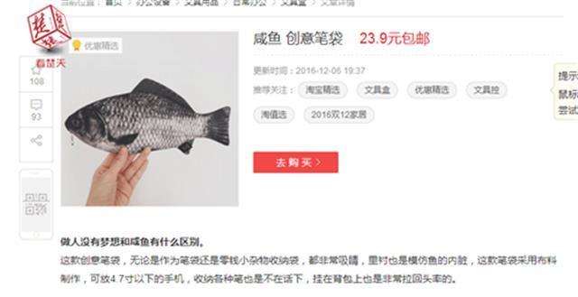 據(jù)了解,“咸魚(yú)”筆袋的主人是個(gè)初一孩子,記者聯(lián)系他的媽媽后得知,筆袋是孩子在網(wǎng)上挑選后,她購(gòu)買(mǎi)的?!安恢浪麨槭裁聪矚g這個(gè)筆袋?!笔潞螅浾咴谔詫?、京東上搜索“咸魚(yú)筆袋”后,也確實(shí)發(fā)現(xiàn)了類(lèi)似的筆袋。