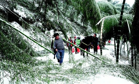 中午12時(shí)30分許,救援隊(duì)一行30余人出發(fā)。上山的路雖然是公路,但積雪很厚,最深處10余厘米,加上結(jié)冰,可謂步步艱難。一路上,被大雪壓斷的楠竹不時(shí)阻斷道路,救援隊(duì)專門請來三名村民,提前砍竹清障。大家跟著馬幫師傅,小心翼翼通過危險(xiǎn)路段。