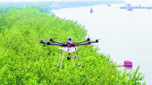 湖北日?qǐng)?bào)訊 6月12日,在嘉魚(yú)縣長(zhǎng)江干堤陸溪段,無(wú)人機(jī)在防浪林上空噴灑低毒無(wú)殘留農(nóng)藥,防治病蟲(chóng)害。近期,嘉魚(yú)段長(zhǎng)江防浪林出現(xiàn)了蟲(chóng)卵和幼蟲(chóng),嘉魚(yú)縣林業(yè)局迅速進(jìn)行綜合防治,全面維護(hù)從陸溪至簰洲灣109公里長(zhǎng)江沿線及洲灘6萬(wàn)余畝楊樹(shù)林。