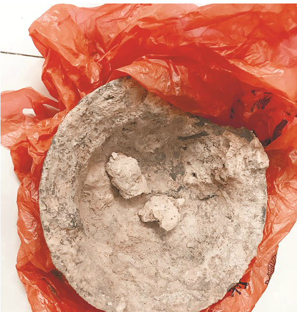 孫師傅說,當村民趕過去的時候,墓穴已被挖開,不少周邊村民都前來圍觀,有人還在墓穴周圍找到了一些銅錢。他們當即報警,當日下午,崇陽縣博物館館長匡文、金塘派出所刑偵人員趕到現(xiàn)場進行了勘查。據(jù)目擊村民介紹,盜挖古墓的是該村的宋某和退休人員盧某,共挖出了6件文物。當天,在警方調(diào)查時,宋某交出了一個破罐、一個鐵器等物件。