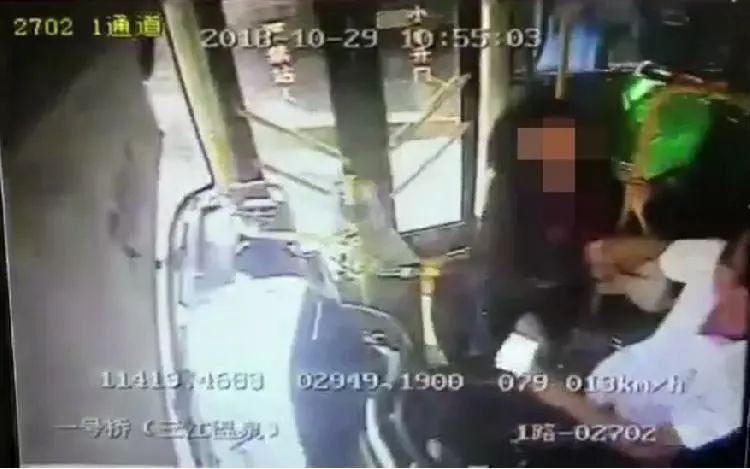 監(jiān)控視頻截屏: 10月29日10點55分03秒,女乘客拉拽公交司機的情景,當時車速為13公里/小時。