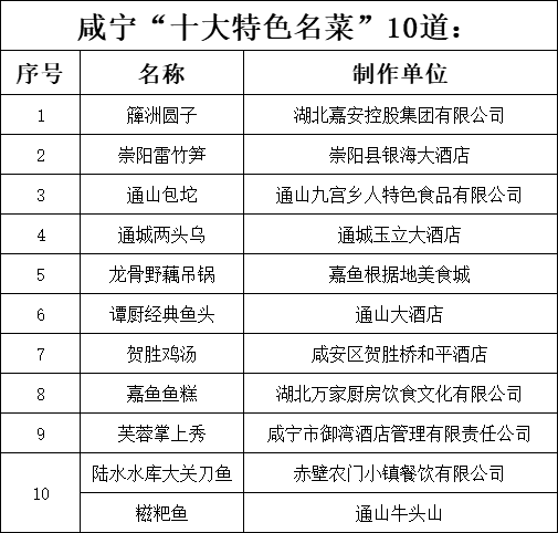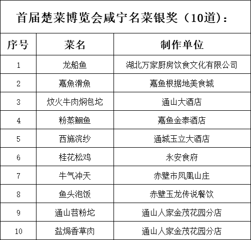 湖北省首屆楚菜博覽會咸寧分會評選頒獎名單如下: