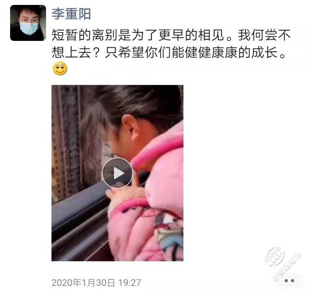 李重陽是中心消殺隊伍中的一員,1月29日,正值大年初五,已經(jīng)近10天沒回家的他接到了到自己所住小區(qū)開展消殺工作的任務(wù)。所有工作完成后,他只能在樓下?lián)芡ㄒ曨l,遠遠的看了一眼妻子,聽著兒女叫了一聲“爸爸”。當天,李重陽發(fā)了這樣一條朋友圈:“短暫的離別是為了更早的相見。我何嘗不想上去?只希望你們能健健康康的成長?!崩钪仃栔皇浅啾诩部乇姸嗄贻p消殺隊員的一個代表。很多人無聊的“家”,正是他們一線疫情防控人員想回卻回不去的“家”。