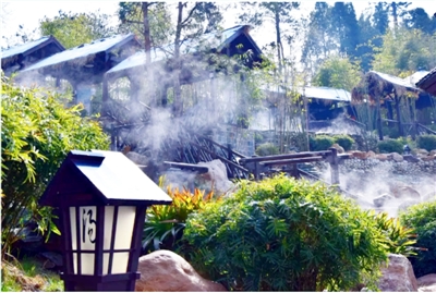 在這里,70多個溫泉泡池高低錯落,或鑲嵌于園林湯院中,或散落于戶外溫泉區(qū)。