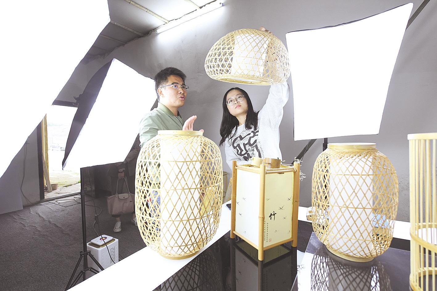 10月14日,咸寧市咸安區(qū)大幕鄉(xiāng)雙垅村竹雕藝人在攝影棚向客人介紹竹制家居用品和工藝品。去年5月,當?shù)卮髮W畢業(yè)生賀慈回鄉(xiāng)創(chuàng)業(yè),成立藝竹情工藝品公司,聘請民間藝人手工制作工藝品,通過電商銷售,今年前三季度銷售額500多萬元。