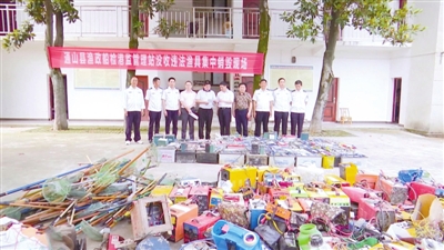 合力“嚴管”形成高壓。7月中旬以來,組織執(zhí)法行動211次,出動執(zhí)法船艇和車輛230臺次,參與執(zhí)法人員1031人次,現(xiàn)場查獲并銷毀各類非法漁具632套、違法電捕設(shè)備21臺(套),查扣非法捕撈漁船2 艘,行政處罰54人,行政罰款1.4萬元,批評教育300余人,刑事立案1起,形成了有效震懾。