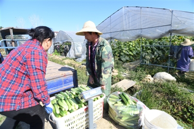 12日,咸安區(qū)綠佳綠色蔬菜專業(yè)合作社蔬菜基地,菜農(nóng)將新鮮采摘的黃瓜稱重運(yùn)往市場。