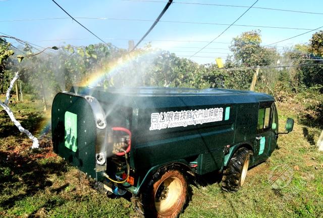 “一輛植保車輕輕松松一小時(shí)噴灑作業(yè)可以達(dá)到25畝以上,這是人工一天‘拉了瓦’也到達(dá)不了的的作業(yè)量。”11月12日,在神山興農(nóng)公司位于官塘驛鎮(zhèn)御屏山村的半島獼猴桃基地,熊堃坐進(jìn)1.5米身高的袖珍新能源植保車,拉動(dòng)手閘,轉(zhuǎn)動(dòng)方向盤,一番操作后,通過(guò)7條噴孔噴出的霧狀藥液在陽(yáng)光下形成一道彩虹。