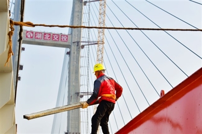 來(lái)自鄂州的胡榮鵬是大橋中跨鋼主梁吊裝班的班長(zhǎng),吃完中午飯,他和工友們便早早地來(lái)到施工作業(yè)面,開始吊裝鋼橫梁。