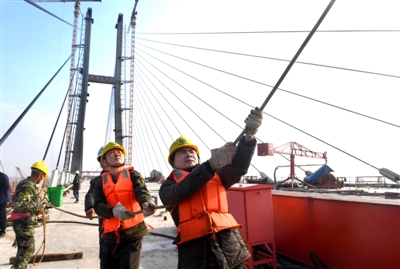 “再起來(lái)一點(diǎn),往左偏5公分,好,?!痹诤鷺s鵬的指揮下,一塊離水面40多米高的鋼梁被順利吊起。