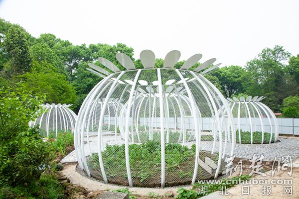 今年,武漢植物園對(duì)罌粟籠子進(jìn)行改造。原來(lái)的黑色大鐵籠被拆除,五個(gè)白色的罌粟果實(shí)狀籠子成為罌粟新“關(guān)押地”?;\子為罌粟蒴果樣式,形狀為圓潤(rùn)的球形,高低不一,矮的籠子3米左右,高的6米有余,錯(cuò)落有致地坐落在本草園中部。五個(gè)籠子面積共200平方米,種植罌粟470株。武漢植物園根據(jù)罌粟的顏色和瓣型將罌粟分籠種植。5個(gè)籠子分別種植了單瓣紅色、單瓣紫色、單瓣白色、重瓣以及混色的罌粟。除了常見(jiàn)的紫色、紅色罌粟,還展示了白色、粉色、雜色罌粟,共10余種花色。