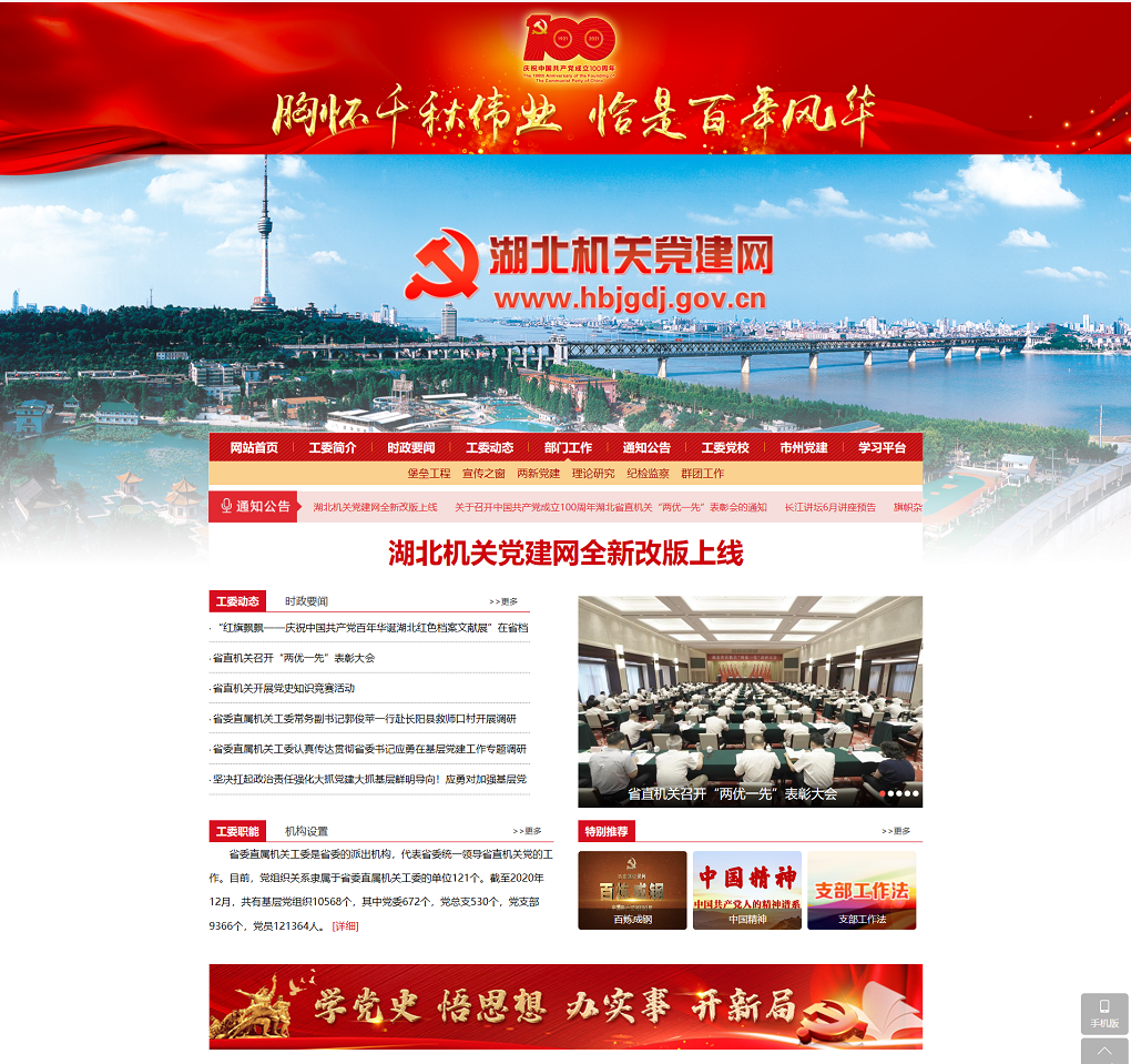 荊楚網(wǎng)(湖北日報網(wǎng))訊(記者謝頤 通訊員鄭羽嬋)在中國共產(chǎn)黨成立100周年之際,湖北機(jī)關(guān)黨建門戶網(wǎng)站湖北機(jī)關(guān)黨建網(wǎng)(http://www.hbjgdj.gov.cn/)電腦端、移動端全新改版上線。這是省委直屬機(jī)關(guān)工委積極探索智慧黨建的有效途徑,是加強(qiáng)省直機(jī)關(guān)黨建宣傳工作的重要舉措,是為黨慶生、為黨祝福獻(xiàn)上的特殊禮物。