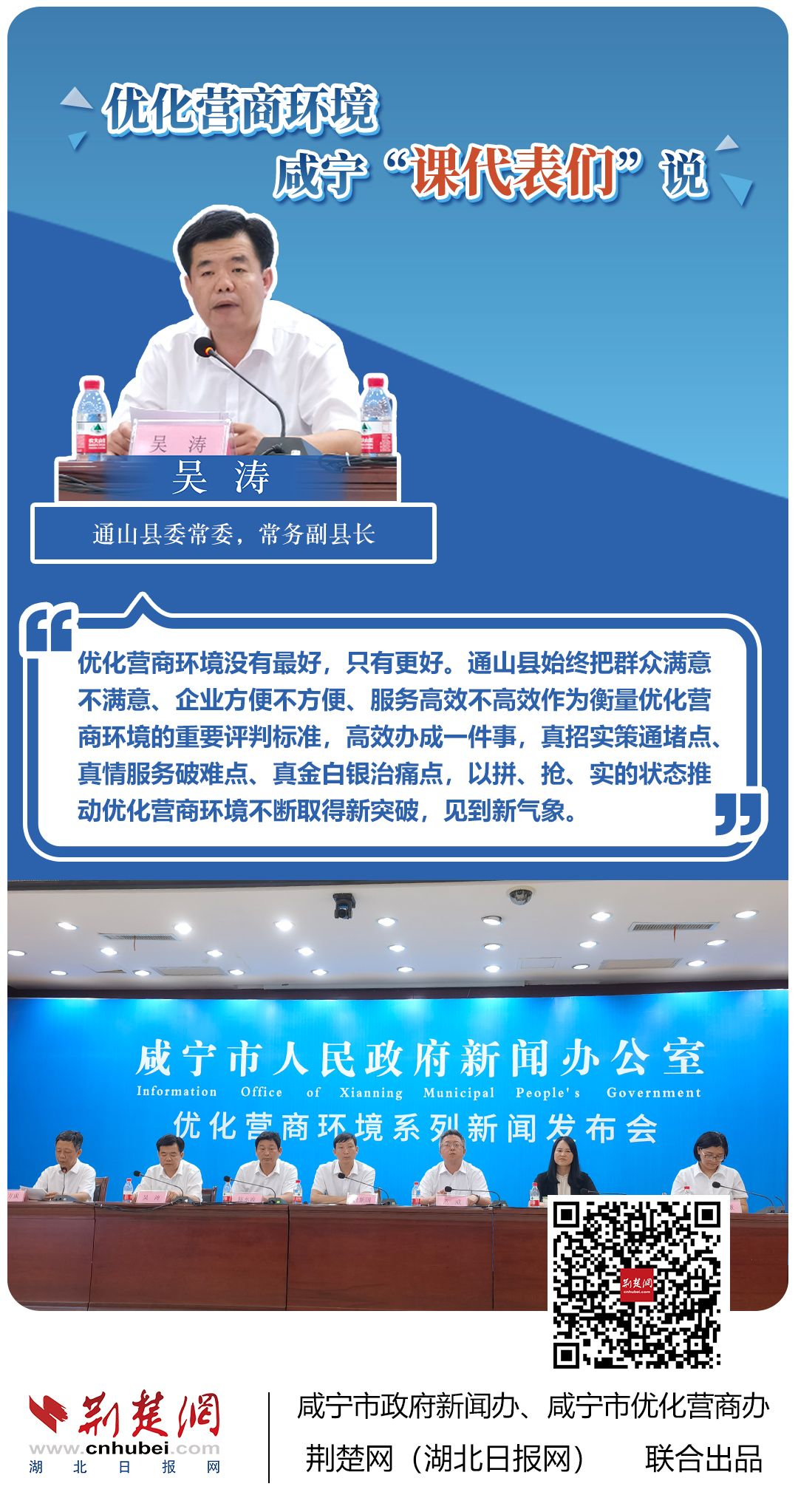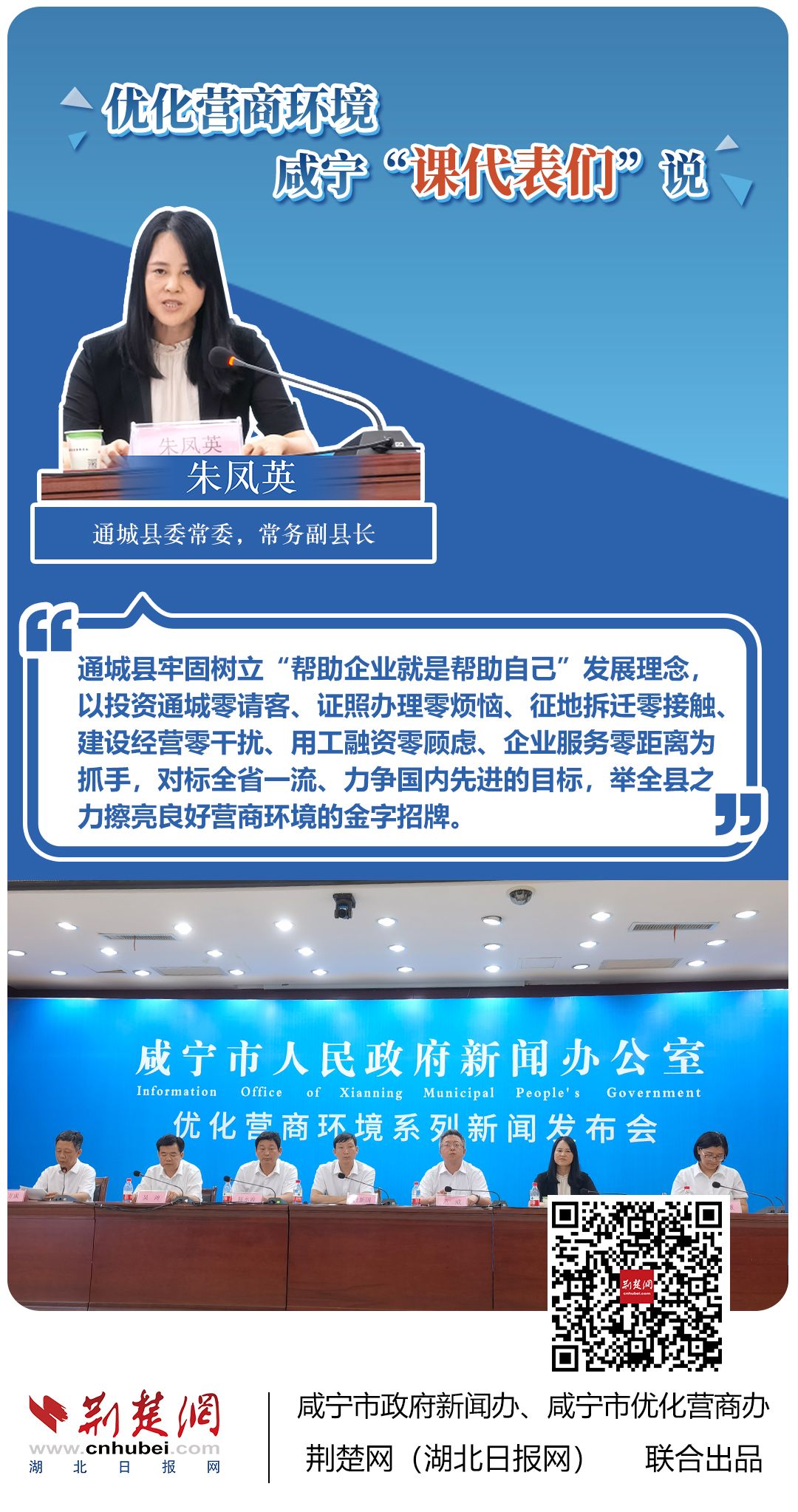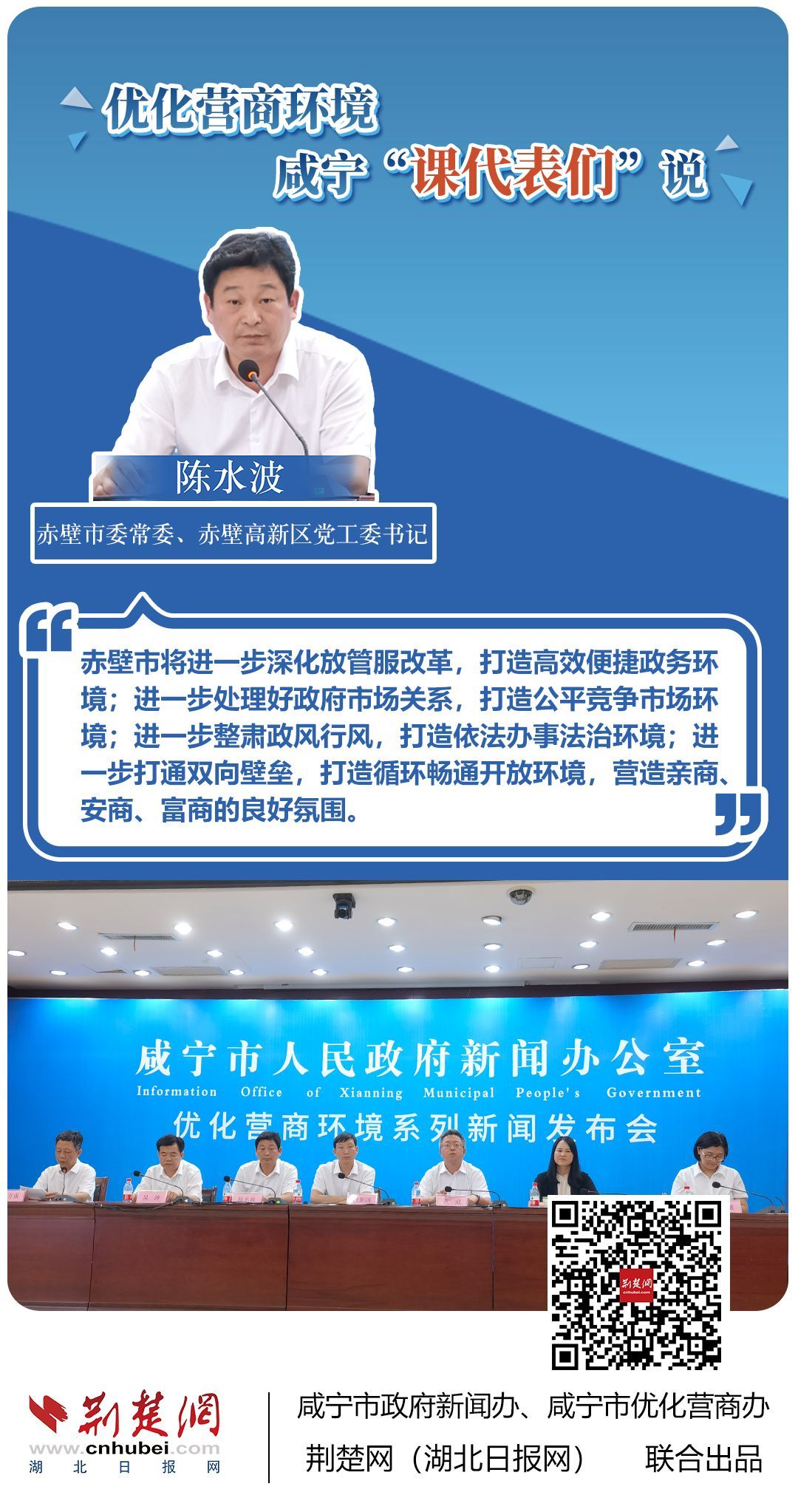 荊楚網(wǎng)(湖北日?qǐng)?bào)網(wǎng))訊(記者 田城 通訊員 孫方成 張永紅)跨省通辦、“零干擾環(huán)境”、最簡(jiǎn)流程優(yōu)服務(wù)、深化“放管服”改革、整肅行風(fēng)政風(fēng)……7月20日下午,咸寧市召開優(yōu)化營(yíng)商環(huán)境新聞發(fā)布會(huì)。會(huì)上,咸安區(qū)、嘉魚縣、赤壁市、通城縣、崇陽縣、通山縣6個(gè)縣市區(qū)優(yōu)化營(yíng)商環(huán)境發(fā)言人亮相,全面介紹當(dāng)?shù)貎?yōu)化營(yíng)商環(huán)境有關(guān)情況,持續(xù)推進(jìn)咸寧市營(yíng)商環(huán)境朝著更優(yōu)、更好方向前進(jìn)。