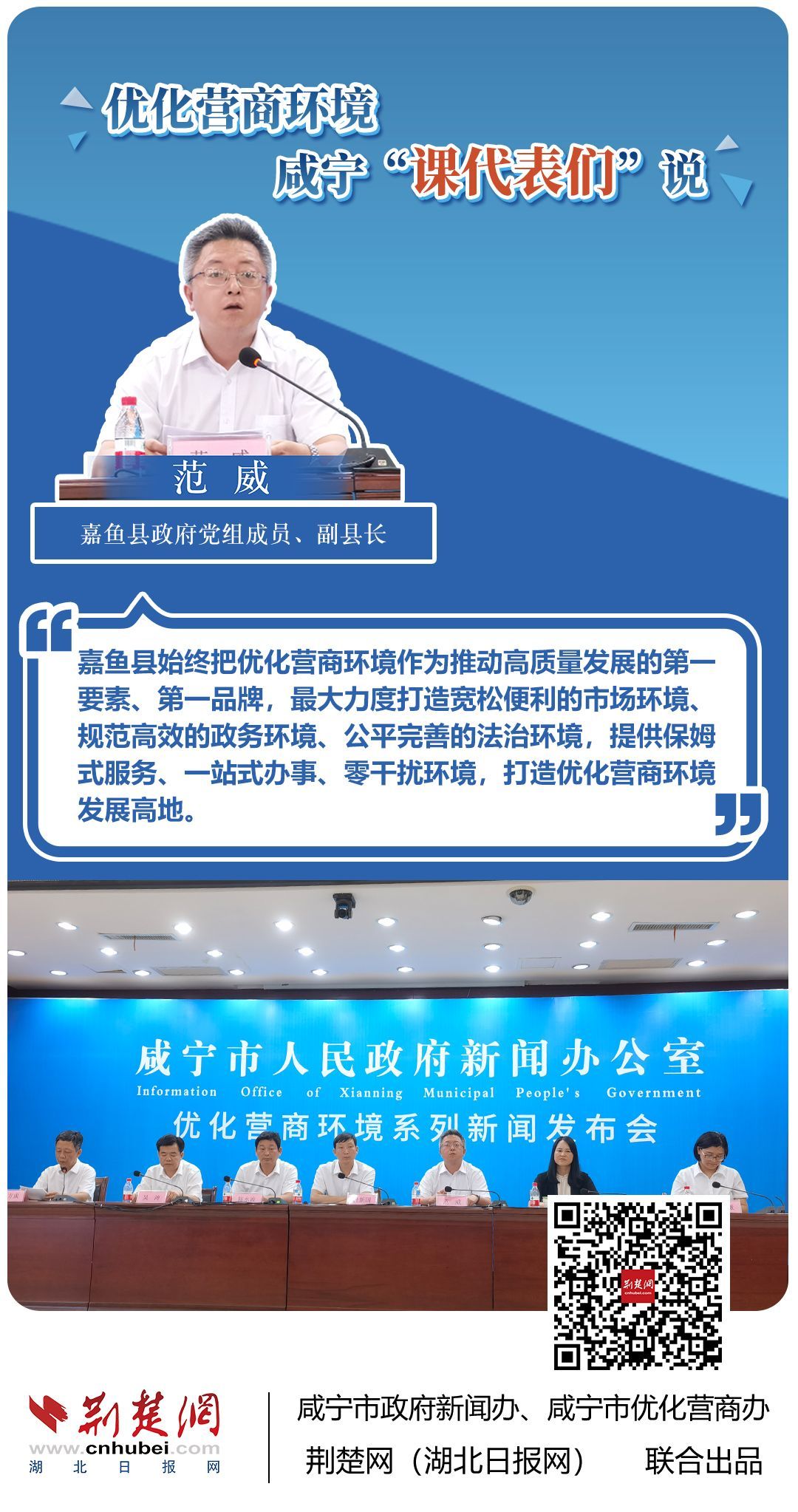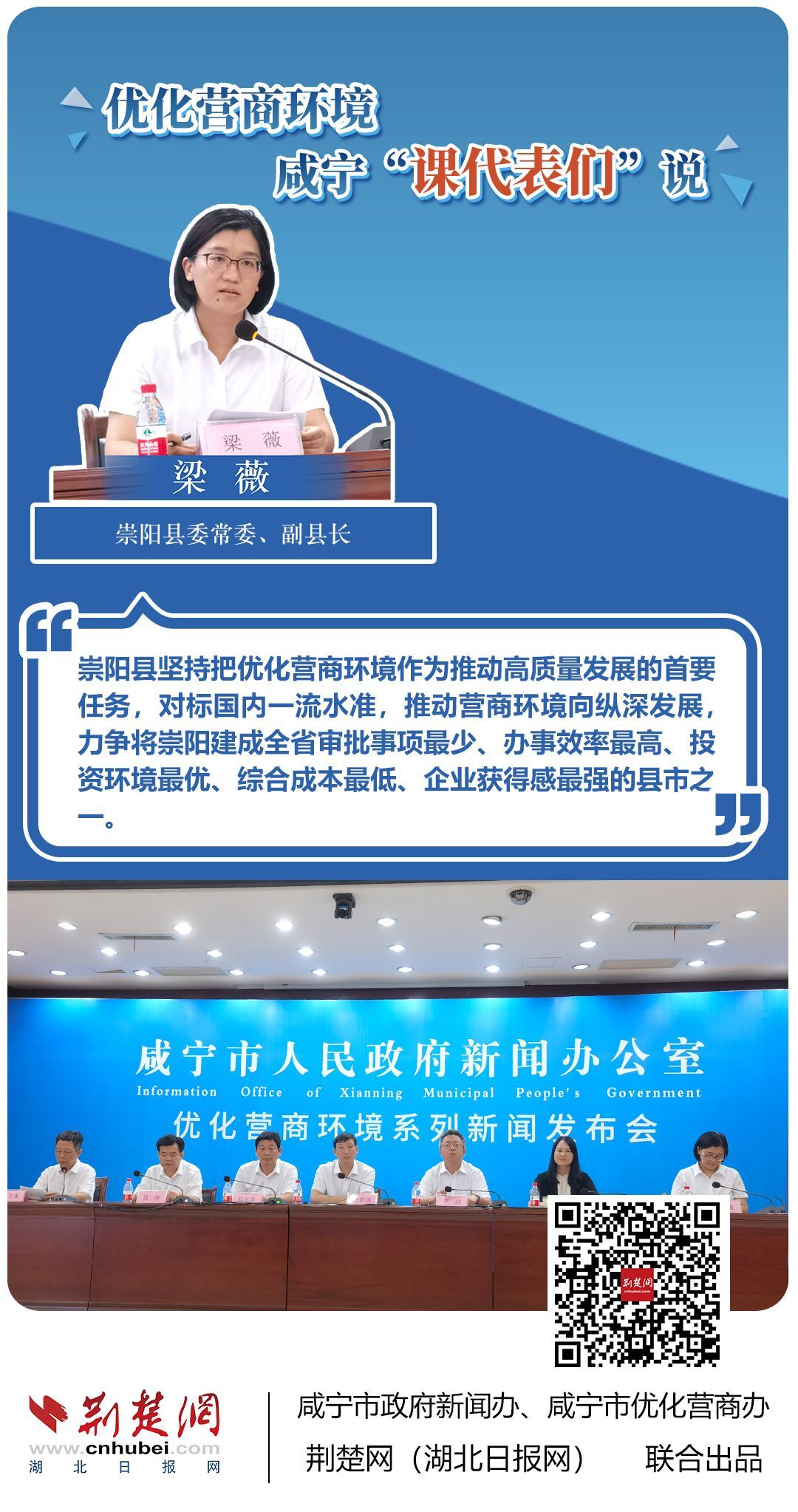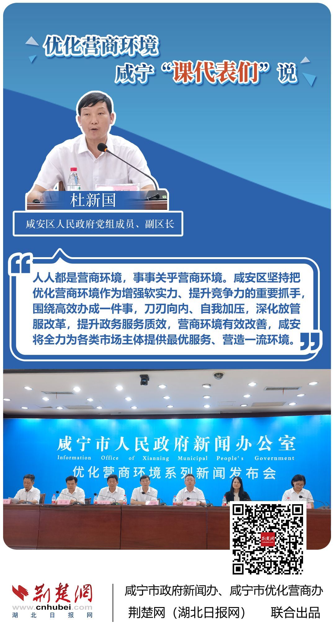 荊楚網(wǎng)(湖北日?qǐng)?bào)網(wǎng))訊(記者 田城 通訊員 孫方成 張永紅)跨省通辦、“零干擾環(huán)境”、最簡(jiǎn)流程優(yōu)服務(wù)、深化“放管服”改革、整肅行風(fēng)政風(fēng)……7月20日下午,咸寧市召開優(yōu)化營(yíng)商環(huán)境新聞發(fā)布會(huì)。會(huì)上,咸安區(qū)、嘉魚縣、赤壁市、通城縣、崇陽縣、通山縣6個(gè)縣市區(qū)優(yōu)化營(yíng)商環(huán)境發(fā)言人亮相,全面介紹當(dāng)?shù)貎?yōu)化營(yíng)商環(huán)境有關(guān)情況,持續(xù)推進(jìn)咸寧市營(yíng)商環(huán)境朝著更優(yōu)、更好方向前進(jìn)。
