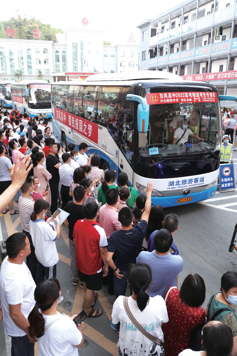 東風(fēng)高中的“少年戰(zhàn)士”踏上高考的征程。車身上的標(biāo)語“圓我報國之夢”為孩子們的夢想做了最好注解。