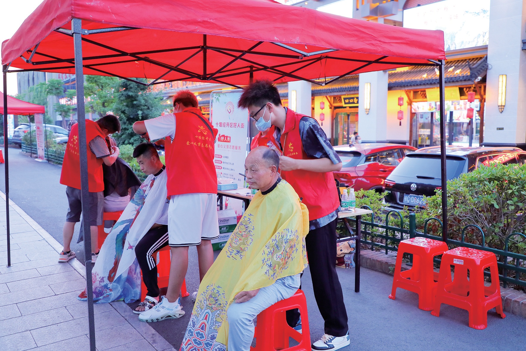 在“好人街”上,志愿者免費(fèi)為居民理發(fā)。