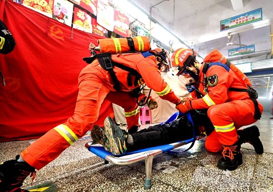 此次演練模擬上窯新安綜合批發(fā)市場A區(qū)一門面因使用取暖器引燃窗簾而引發(fā)火災(zāi),火勢迅速蔓延,形成大面積火災(zāi),火勢封閉疏散通道,有2人被困。