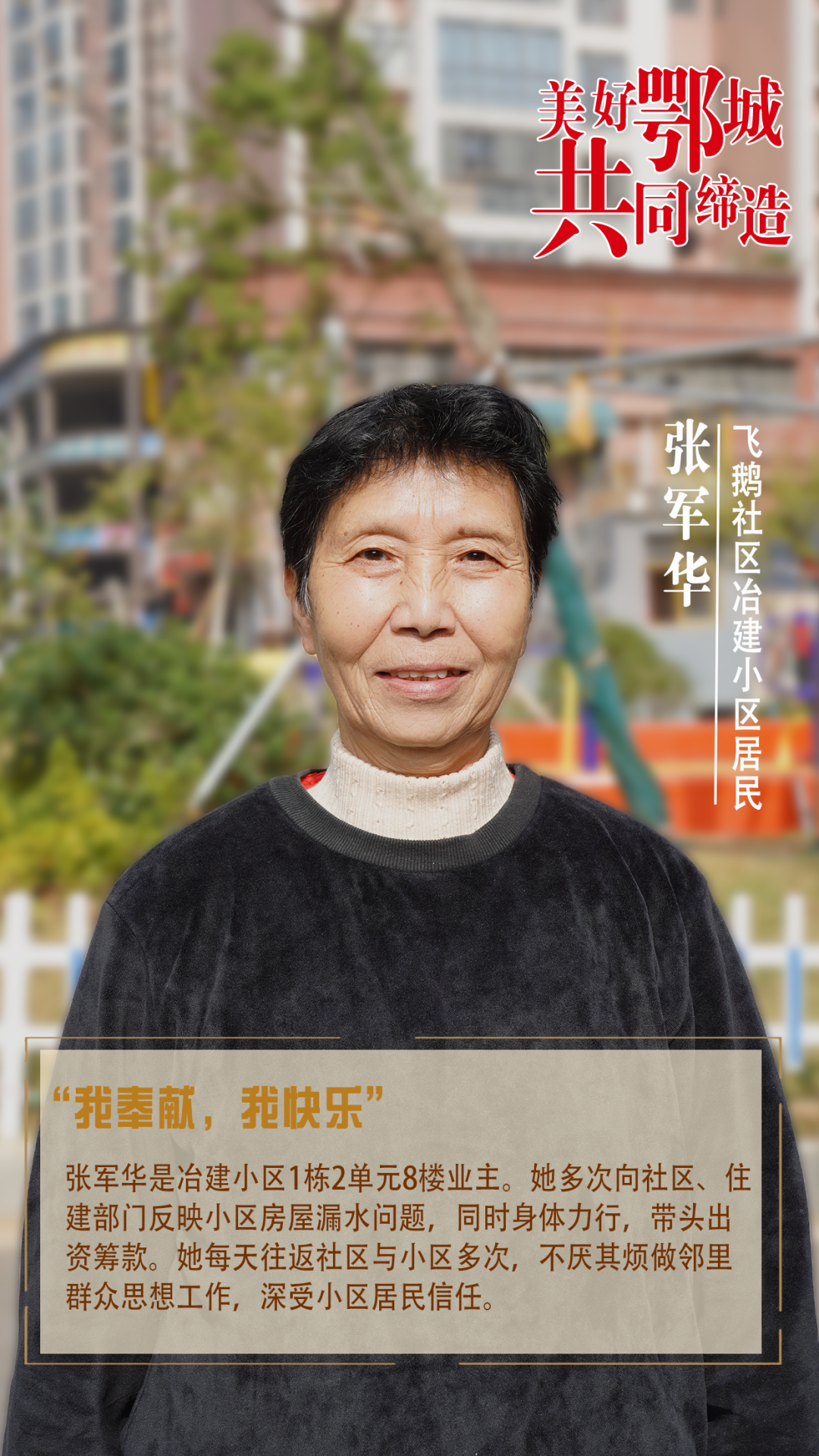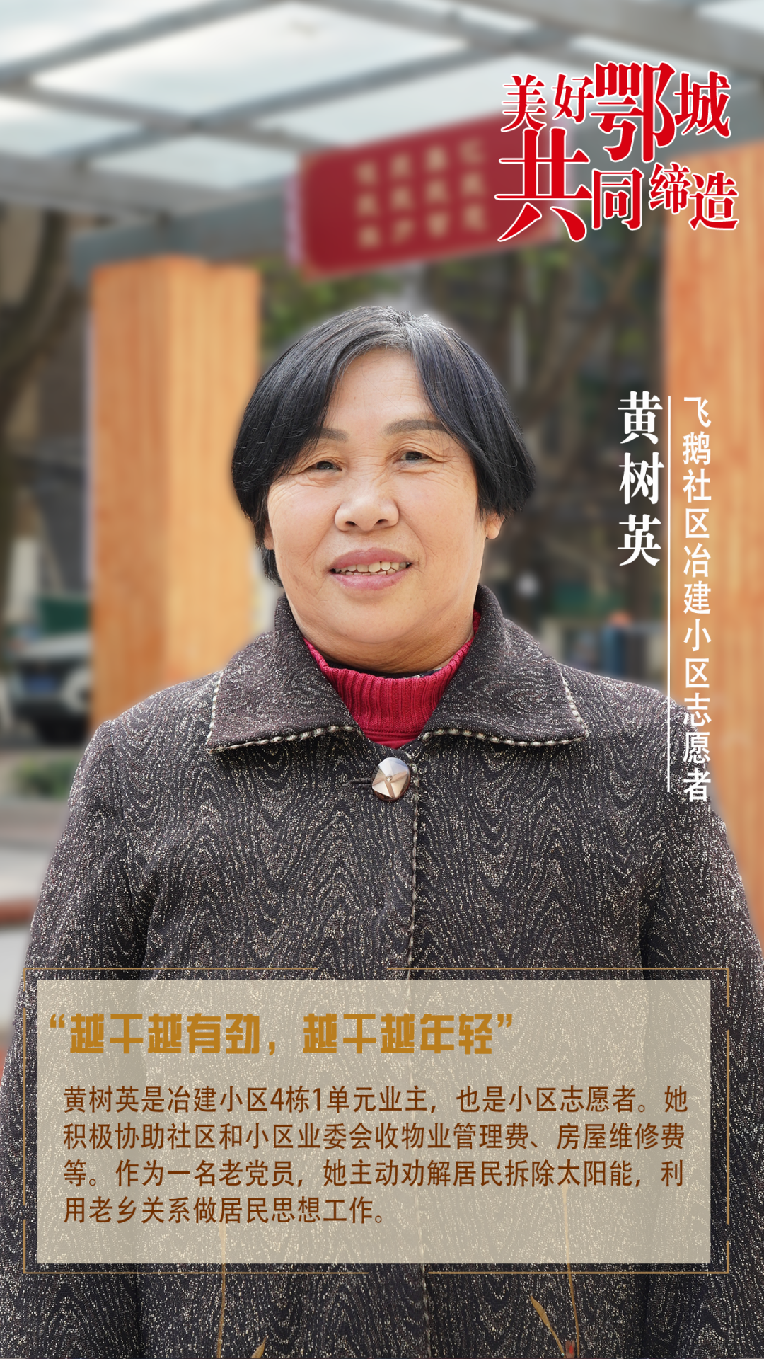 黃樹(shù)英是冶建小區(qū)4棟1單元業(yè)主,也是小區(qū)志愿者。她積極協(xié)助社區(qū)和小區(qū)業(yè)委會(huì)收物業(yè)管理費(fèi)、房屋維修費(fèi)等。作為一名老黨員,她主動(dòng)勸解居民拆除太陽(yáng)能,利用老鄉(xiāng)關(guān)系做居民思想工作。