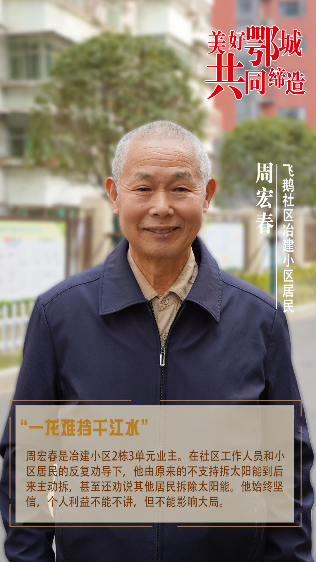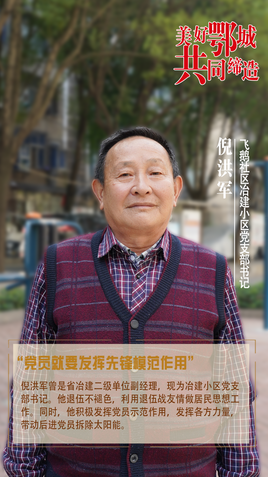 倪洪軍曾是省冶建二級(jí)單位副經(jīng)理,現(xiàn)為冶建小區(qū)黨支部書(shū)記。他退伍不褪色,利用退伍戰(zhàn)友情做居民思想工作。同時(shí),他積極發(fā)揮黨員示范作用,發(fā)揮各方力量,帶動(dòng)后進(jìn)黨員拆除太陽(yáng)能。