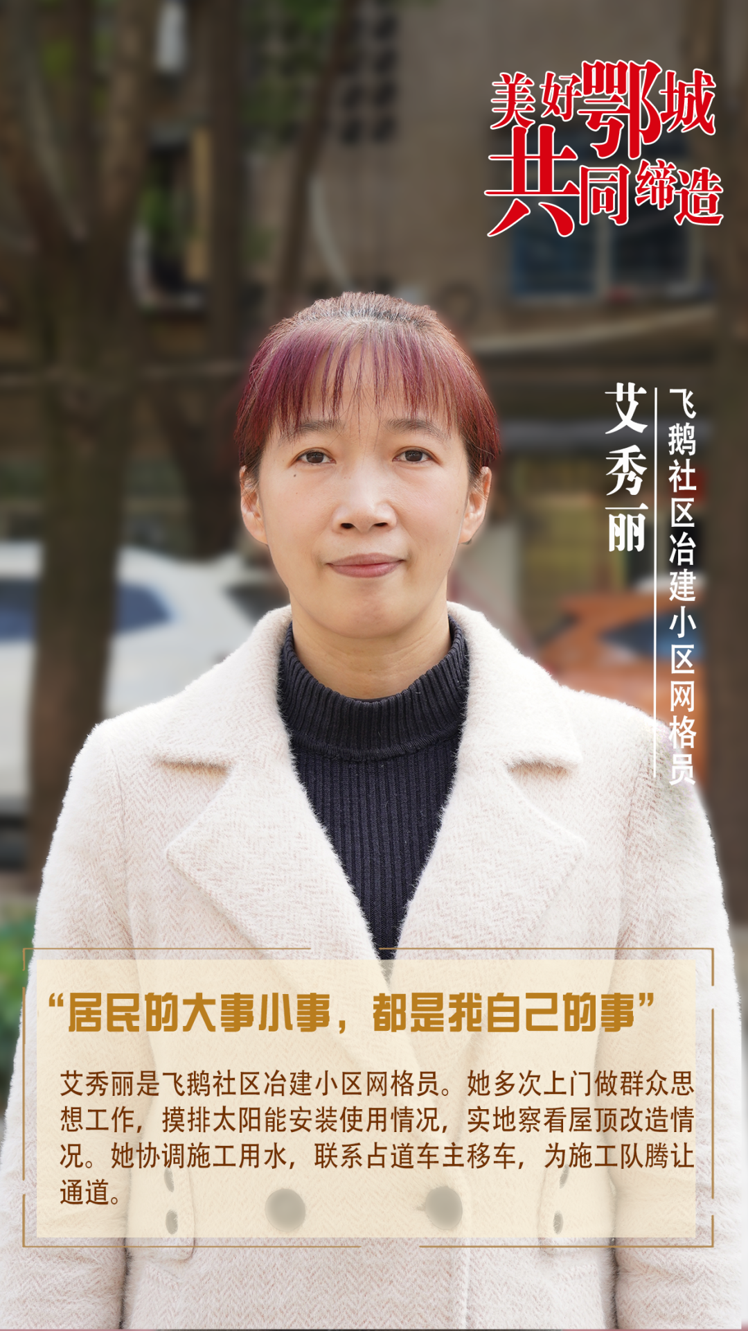 艾秀麗是飛鵝社區(qū)冶建小區(qū)網(wǎng)格員。她多次上門(mén)做群眾思想工作,摸排太陽(yáng)能安裝使用情況,實(shí)地察看屋頂改造情況。她協(xié)調(diào)施工用水,聯(lián)系占道車主移車,為施工隊(duì)騰讓通道。