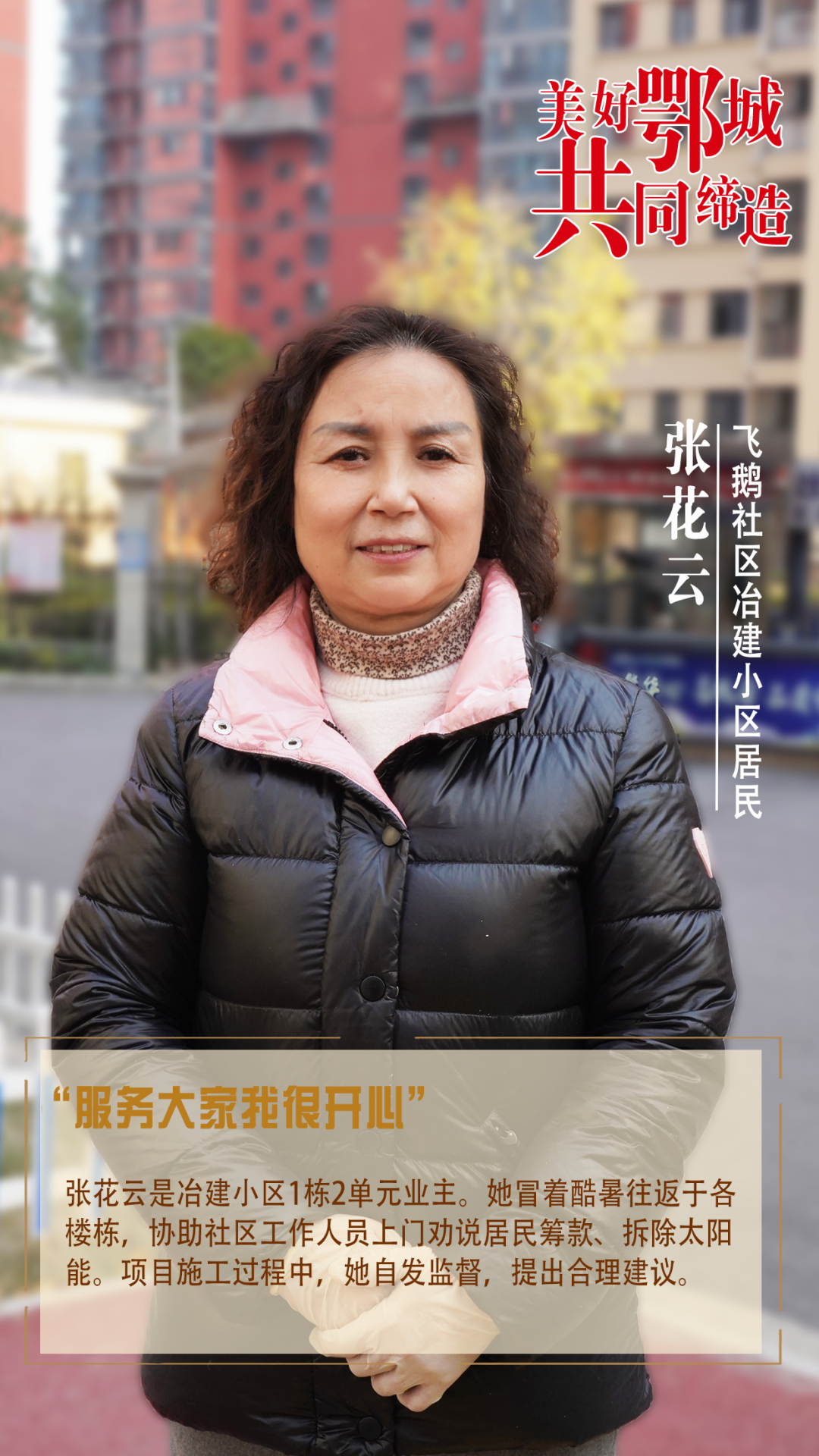 張花云是冶建小區(qū)1棟2單元業(yè)主。她冒著酷暑往返于各樓棟,協(xié)助社區(qū)工作人員上門(mén)勸說(shuō)居民籌款、拆除太陽(yáng)能。項(xiàng)目施工過(guò)程中,她自發(fā)監(jiān)督,提出合理建議。
