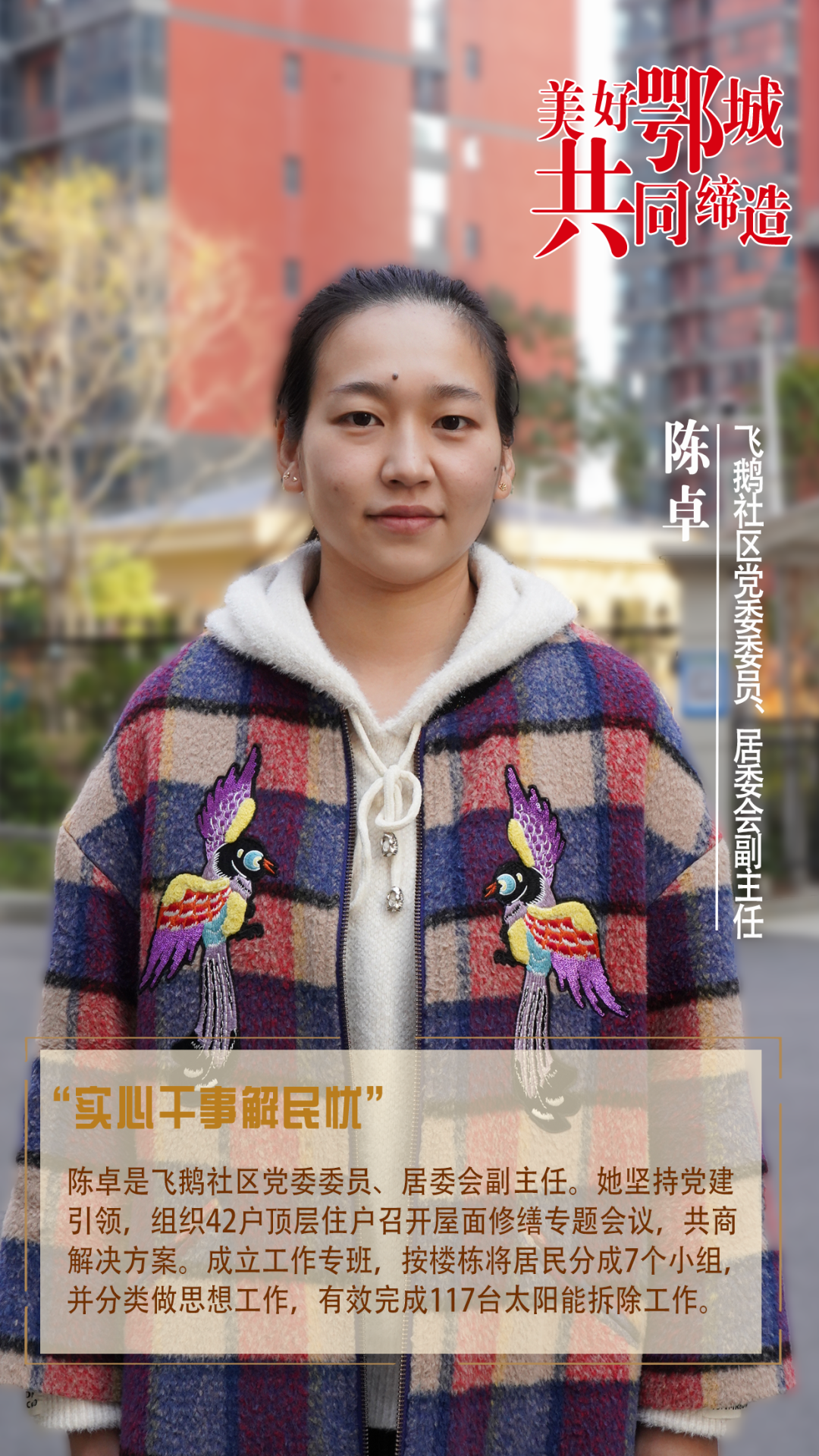 陳卓是飛鵝社區(qū)黨委委員、居委會(huì)副主任。她堅(jiān)持黨建引領(lǐng),組織42戶頂層住戶召開(kāi)屋面修繕專題會(huì)議,共商解決方案。成立工作專班,按樓棟將居民分成7個(gè)小組,并分類做思想工作,有效完成117臺(tái)太陽(yáng)能拆除工作。