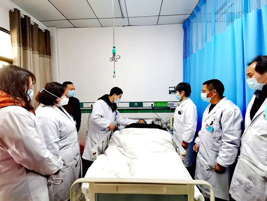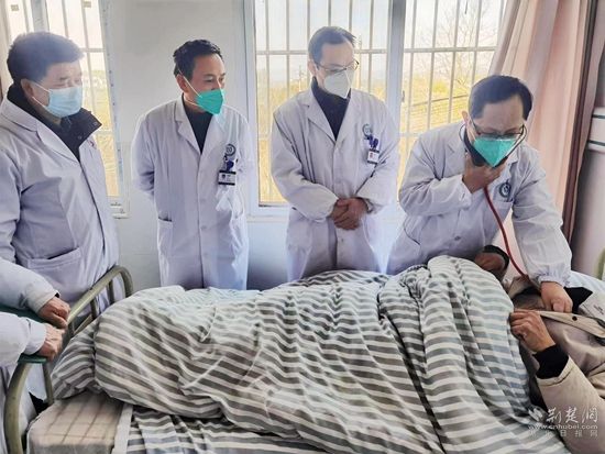 荊楚網(wǎng)(湖北日?qǐng)?bào)網(wǎng))訊(通訊員程曉林 李 勇 饒國(guó)?。?/strong>1月6日下午4時(shí)10分,在浠水縣綠楊鄉(xiāng)衛(wèi)生院三樓住院部病房里,浠水縣人民醫(yī)院副院長(zhǎng)、主任醫(yī)師黃大雄帶領(lǐng)該院第5醫(yī)療救治專家組主任醫(yī)師付鴻鷹、副主任醫(yī)師柴小利同綠楊衛(wèi)生院醫(yī)務(wù)人員一起,給82歲的新冠感染患者張鳳銀婆婆進(jìn)行會(huì)診。