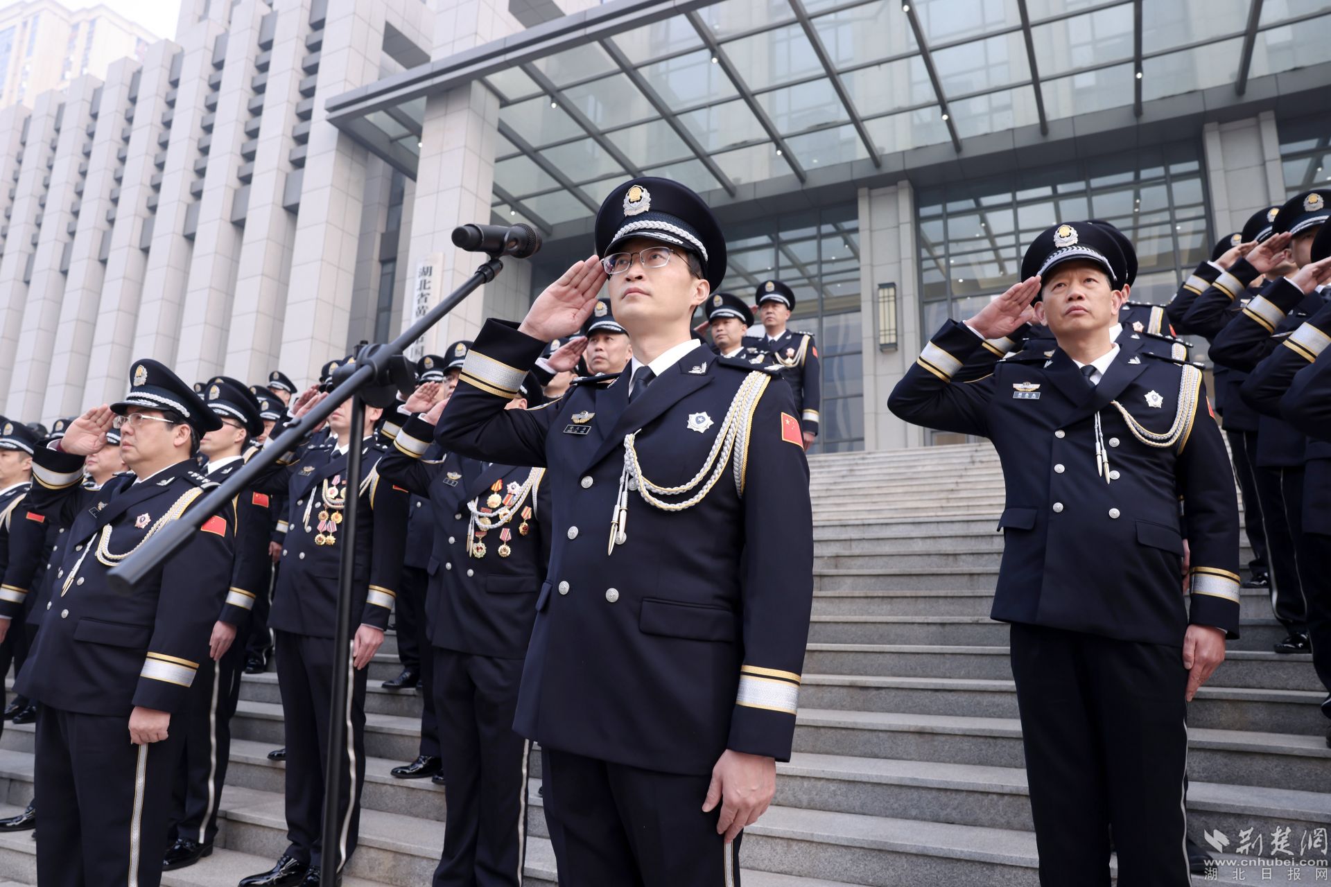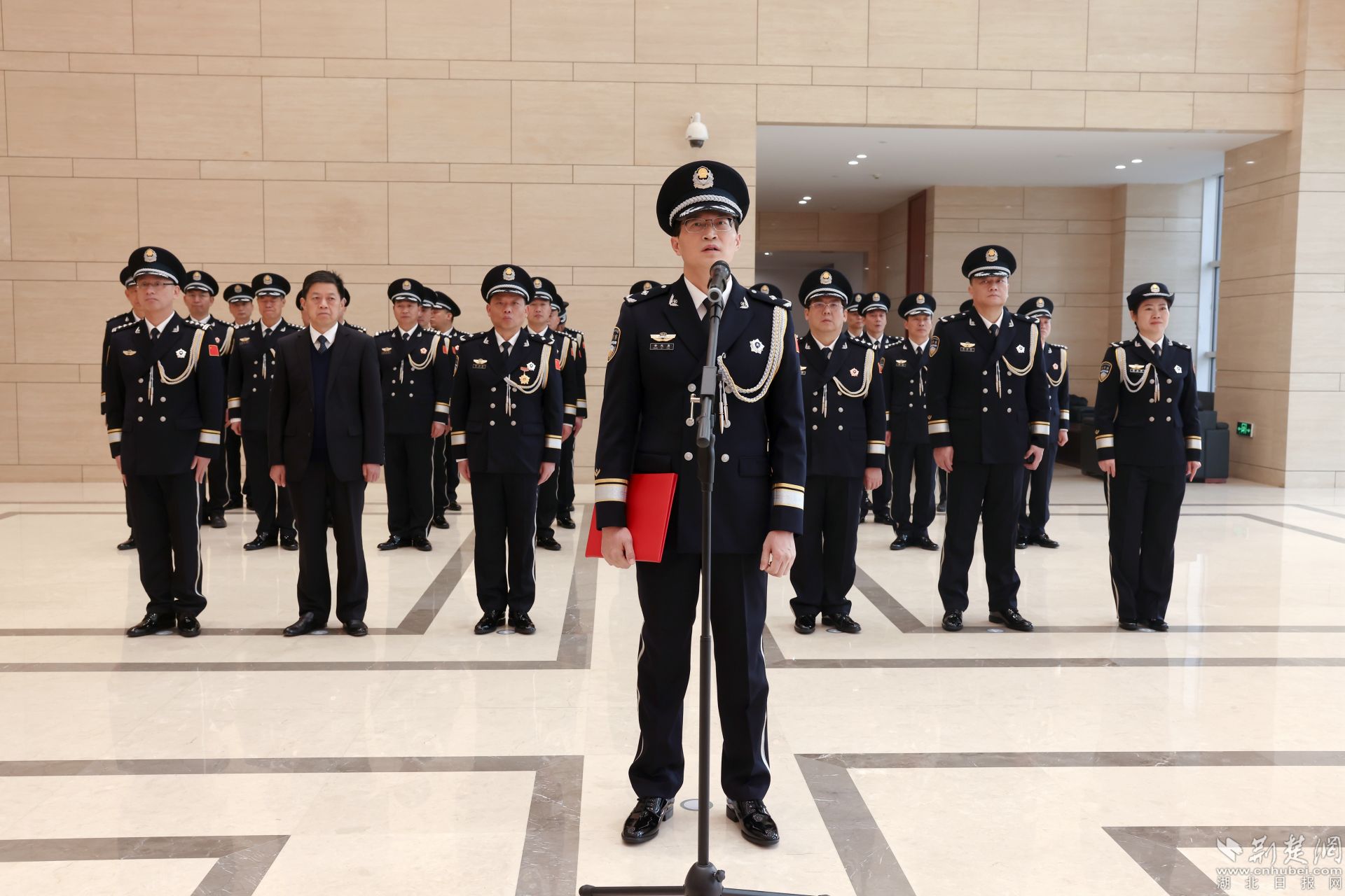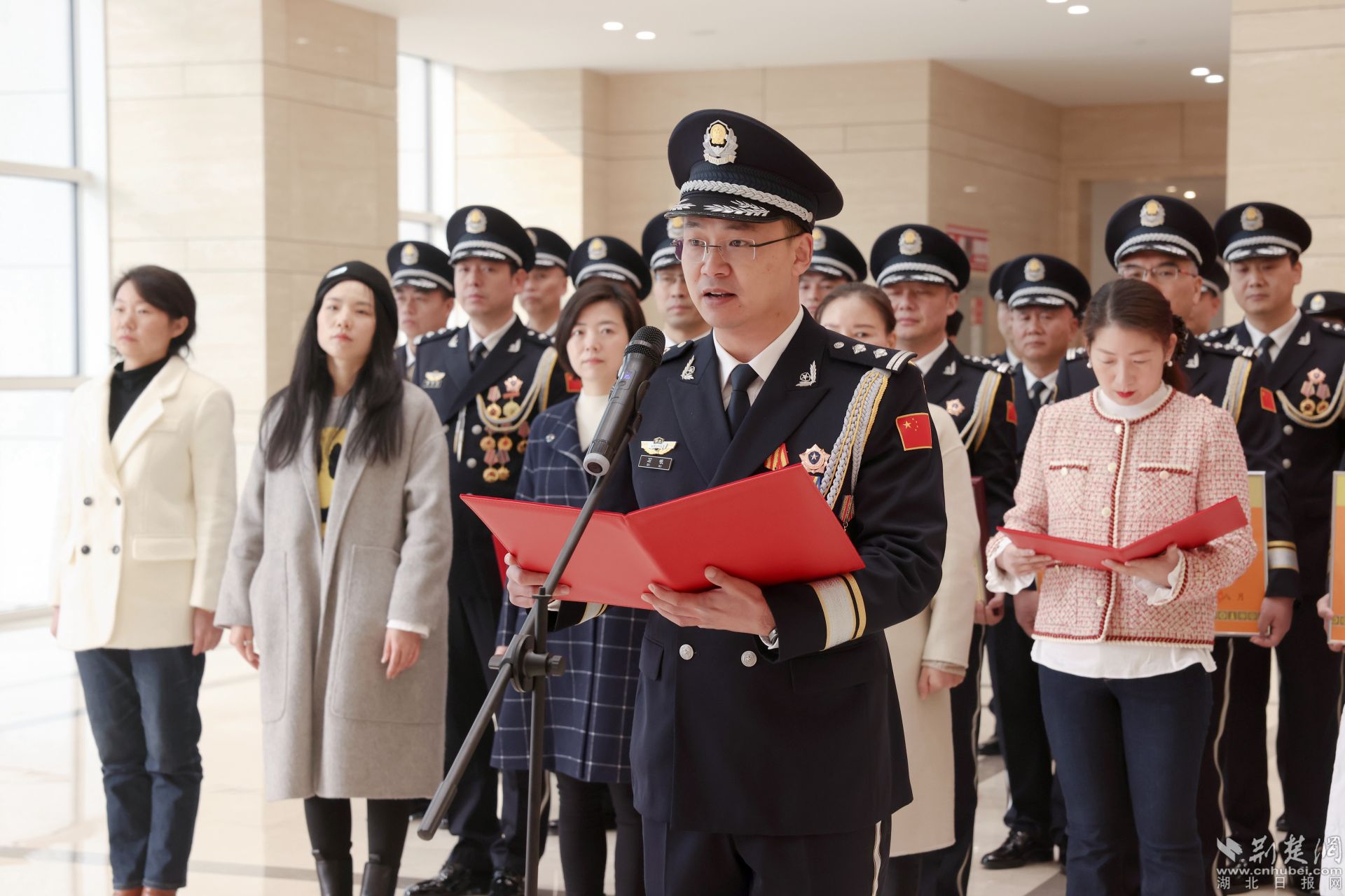 飄揚(yáng)的警旗下,黃石市副市長(zhǎng)、市公安局黨委書記、局長(zhǎng)黃志勇帶領(lǐng)大家重溫入警誓詞:“我是中國(guó)人民警察,我宣誓……”全體民警高舉右臂,緊握右拳,鏗鏘有力的話語表達(dá)對(duì)公安事業(yè)的無限熱愛。