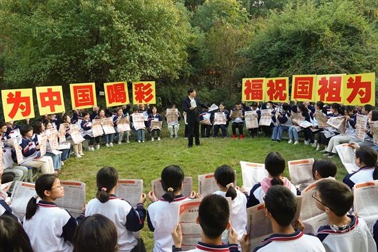 同學們手舉“踔厲奮發(fā) 砥礪前行”“為中國喝彩 為祖國祝?!钡葮伺苹訜崃摇?/p>