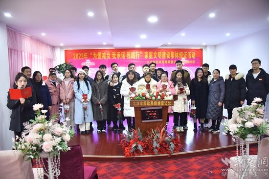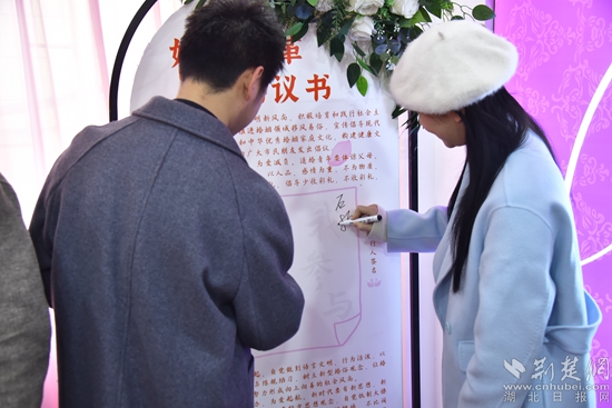 荊楚網(wǎng)(湖北日?qǐng)?bào)網(wǎng))訊(通訊員 杜巧云、石姣、陳?。?/strong>“我承諾:抵制高價(jià)彩禮,為愛(ài)減負(fù),拒絕低俗婚鬧,為愛(ài)守禮,主張婚事簡(jiǎn)辦,為愛(ài)啟航,傳承優(yōu)秀文化,為愛(ài)踐行……”2月14日上午,大冶市婚姻登記處為當(dāng)日上午登記領(lǐng)證的50對(duì)新人舉行“為愛(ài)減負(fù),我承諾、我踐行”集體頒證活動(dòng),新人們?cè)谶@個(gè)特殊的日子集體宣誓并在《婚俗改革倡議書(shū)》上簽字承諾。
