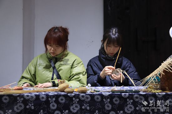 在演出現(xiàn)場旁的鄉(xiāng)村記憶館內(nèi),馬橋油畫風(fēng)景寫生展、鄂南雕花剪紙作品展同時吸引著游人的目光。來自湖北科技學(xué)院的學(xué)生正在展廳中編織特色竹制品,繪制富有當?shù)孛袼滋攸c的文創(chuàng)作品。