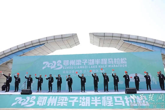 活動(dòng)現(xiàn)場(chǎng),中共鄂州市委書(shū)記孫兵,湖北省體育局二級(jí)巡視員胡晶珊,鄂州市人大副主任周秀華,鄂州市委常委、宣傳部部長(zhǎng)鄒霞,鄂州市委常委、副市長(zhǎng)盧輝,鄂州市副市長(zhǎng)、公安局長(zhǎng)方勇,鄂州市副市長(zhǎng)邱實(shí),鄂州市政府黨組成員李梁軍共同為比賽鳴槍發(fā)令。一聲整齊的發(fā)令槍聲響徹云霄,打響了2023鄂州梁子湖半程馬拉松起跑的號(hào)角。